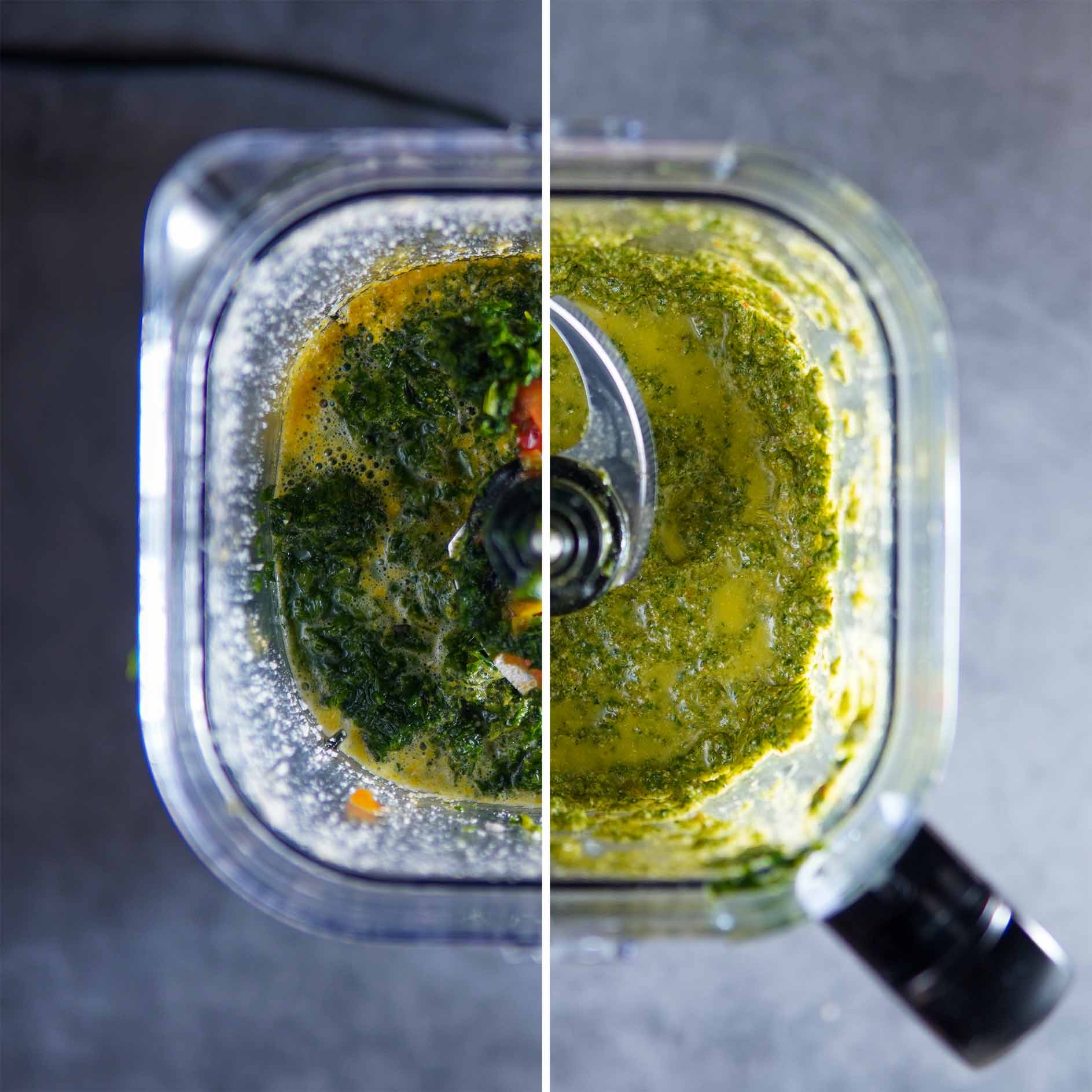 - Die pürierten Cashewkerne verleihen dem Palak Paneer auch ohne Milchprodukte eine angenehme und sättigende Konsistenz. Damit die Kerne wirklich fein werden (dann schon fast wie eine Cashew-Milch), müssen diese zunächst zusammen mit der Gemüsebrühe püriert werden, bevor die restlichen Zutaten in den Mixer kommen. Selbst mit meinem Hochleistungsmixer werden die Cashewkerne nicht fein genug, wenn diese direkt mit dem Spinat und der Masse aus der Pfanne mixt. Deswegen unbedingt vorab nur mit der Gemüsebrühe glatt pürieren. Alternativ kannst du die Cashewkerne über Nacht in Wasser einweichen lassen oder für ein paar Stunden in heißem Wasser (dieses Wasser nach dem Einweichen wegschütten).